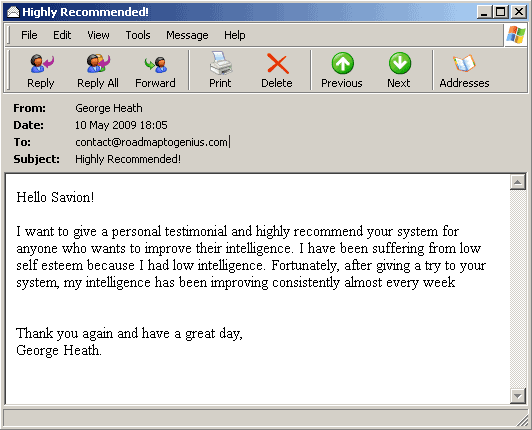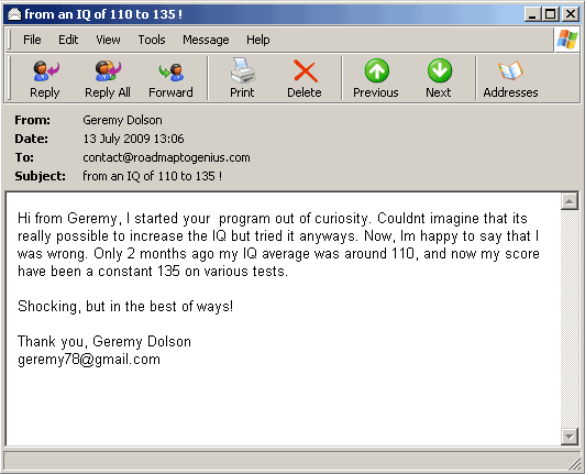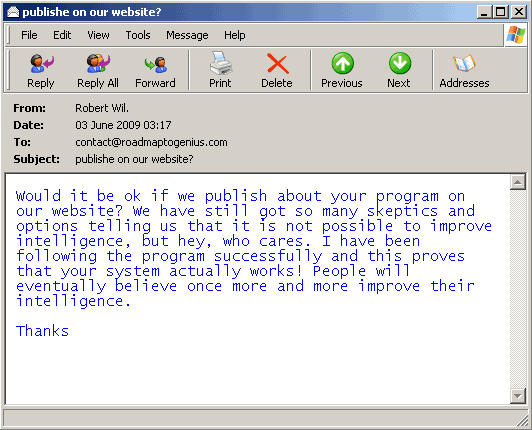"Would it be ok if we publish about your program on our website? We have still got so many skeptics telling us that it is not possible to improve intelligence, but hey, who cares. I have been following the program successfully and this proves that your system actually works! People will eventually believe once more and more improve their intelligence. Thanks"