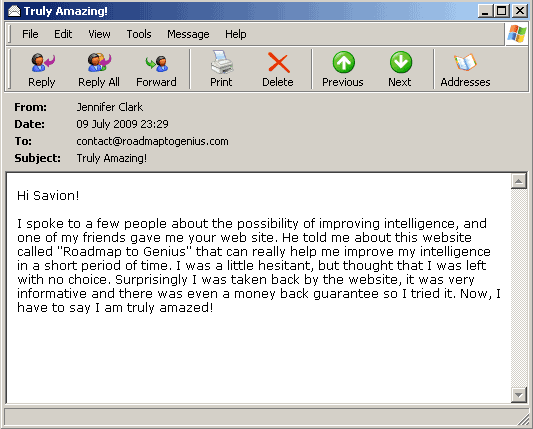 "I spoke to a few people about the possibility of improving intelligence, and one of my friends gave me your web site. He told me about this website called "Roadmap to Genius" that can really help me improve my intelligence in a short period of time. I was a little hesitant, but thought that I was left with no choice. Surprisingly I was taken back by the website, it was very informative and there was even a money back guarantee so I tried it. Now, I have to say I am truly amazed!"