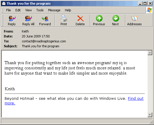 "Would it be ok if we publish about your program on our website? We have still got so many skeptics telling us that it is not possible to improve intelligence, but hey, who cares. I have been following the program successfully and this proves that your system actually works! People will eventually believe once more and more improve their intelligence. Thanks"